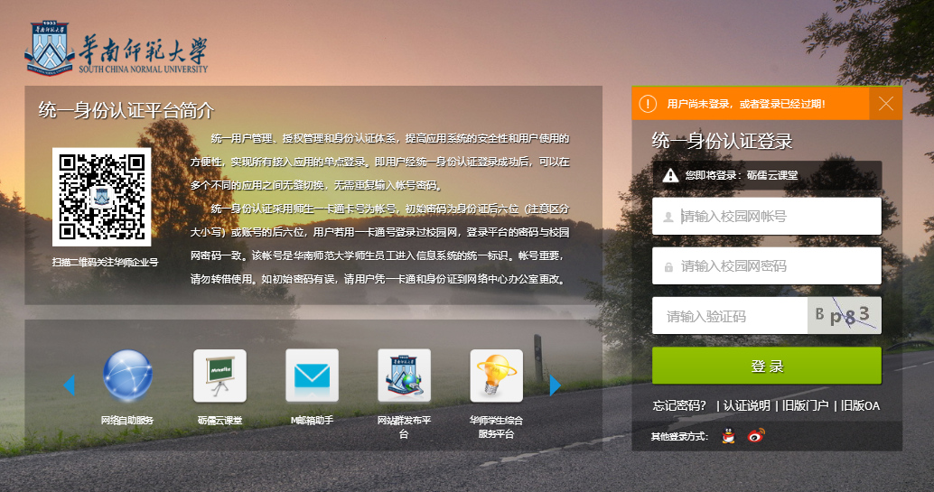 5、校内用户则通过华南师范大学统一身份认证登录平台。